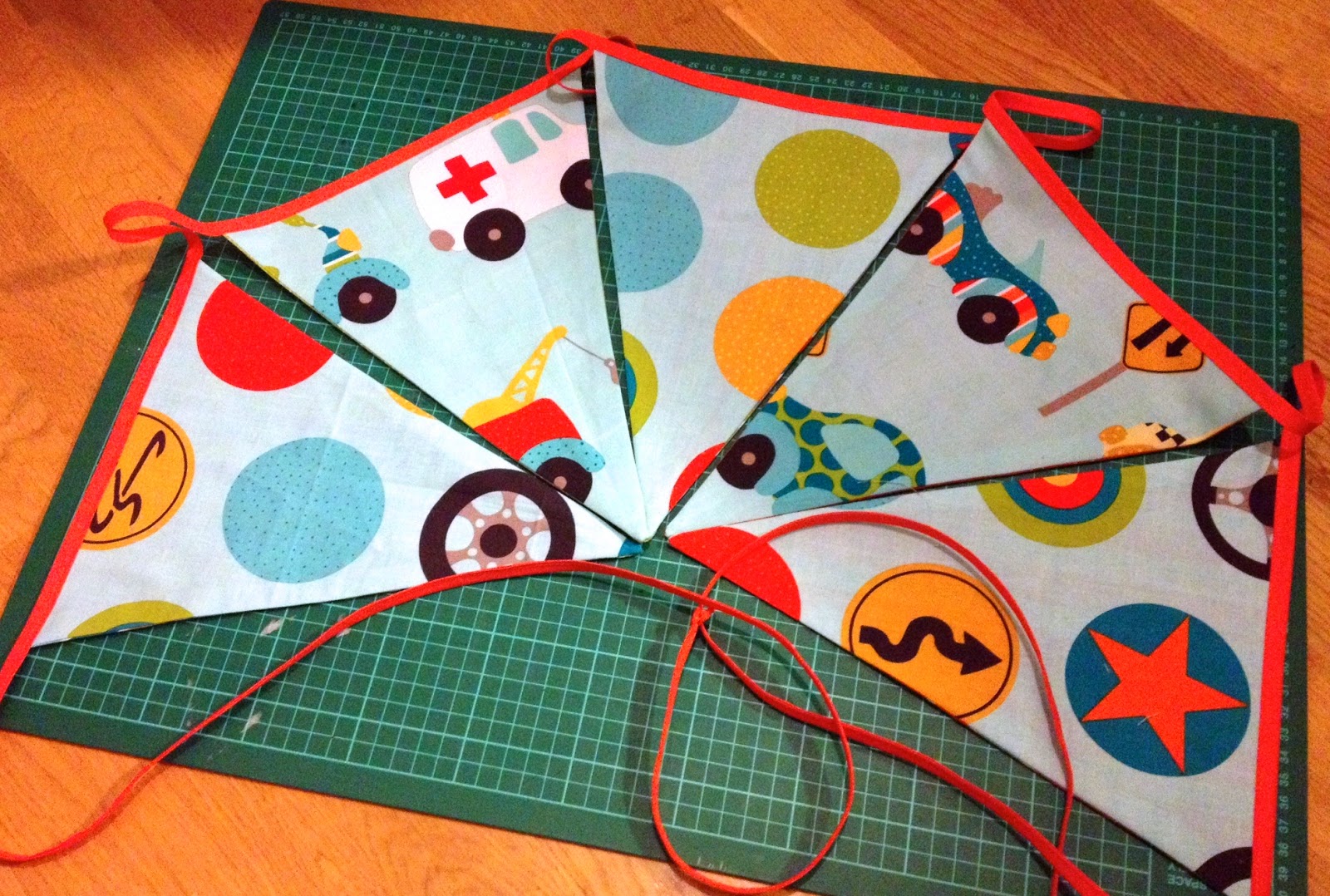 När jag sydde dessa vimplar var jag dock glad att ha en mindre sybehörsaffär i mitt rum, jag hade faktiskt köpt på mig en hel fat-quarter-bundle med dessa tyger (inte mindre än 25 matchande tyger) förra året med tanke att quilta en elefantquilt att hänga på väggen i minsta sonens rum. Det har inte blivit av (och det finns tyg kvar till med med) och tygerna bara skrek att de ville bli vimplar. Kunde matcha snyggt med de olika tygerna och gillar att mönstren tar upp igen i tygen som används på baksidan av vimplarna. Sedan kunde jag dyka ner i min bandlåda och fiska fram lite snedslå i en näst intill exakt orange nyans. En matchande tråd fanns naturligtvis också!