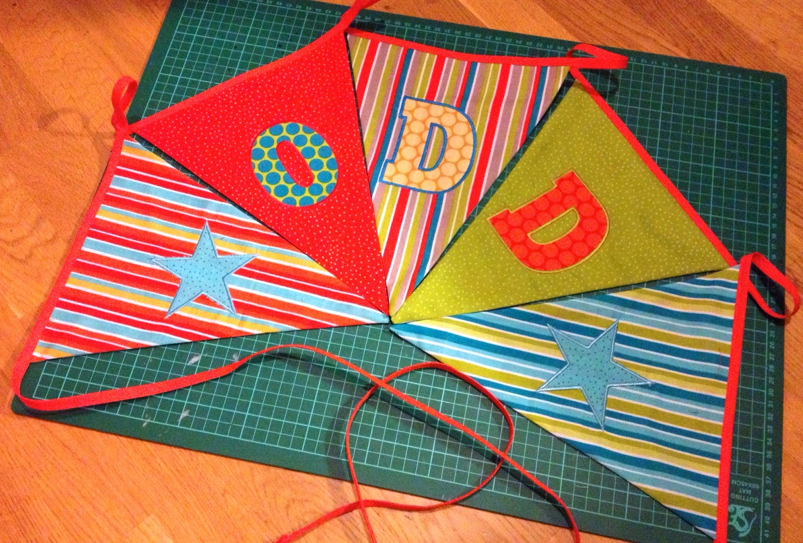 Nu har jag sytt vimplar till ett par vänners son som fyller år. Ville göra något som kan vara fint och roligt ha ett tag framöver och gjorde en färgglad namnvimpel. Broderade bokstäver och stjärnor på min maskin. Först höll jag på att ge upp, det funkade verkligen inte. Tänkte tanken att slänga skitmaskinen genom fönstret. Sedan kom jag på att det inte var maskinen som var skit, det var visst skit bakom spakarna. Hade glömt att byta pressarfot. Satte på den rätta pressarfoten och vips så blev det kanonbra!
