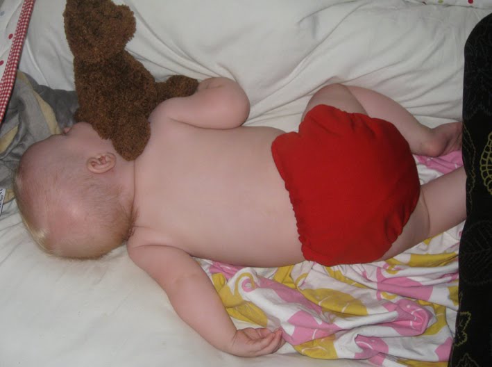 Allt material hade jag hemma. Innertyg i ljusgrön bambuvelour, yttertyget är röd PUL som jag fått spillbitar av efter blöjsömnaden. Inne i bindan har jag ett lager med flanell (även det lagret med vingar) och i flanellen har jag sicksackat fast två lager frotté från en redan slaktad gammal handduk. Sydde sedan kanaler genom flanellen ner i kärnan innan jag vändsydde ihop allting.