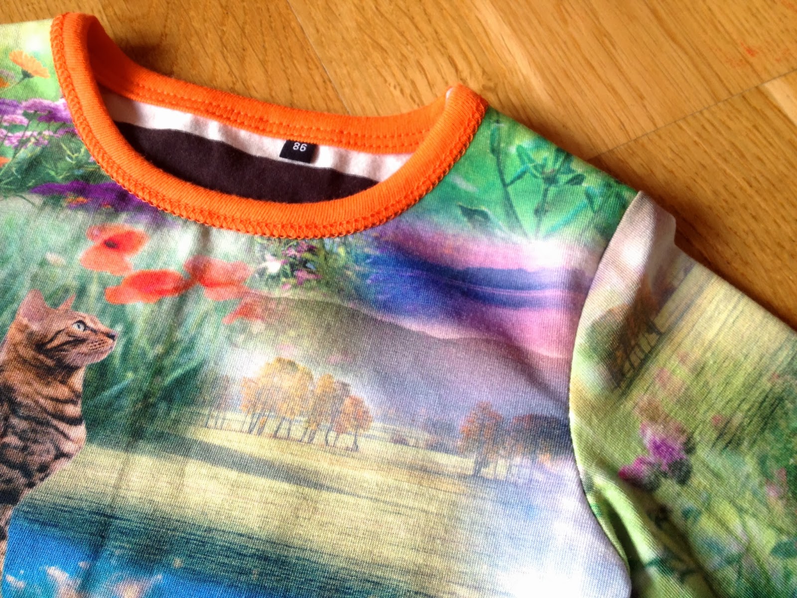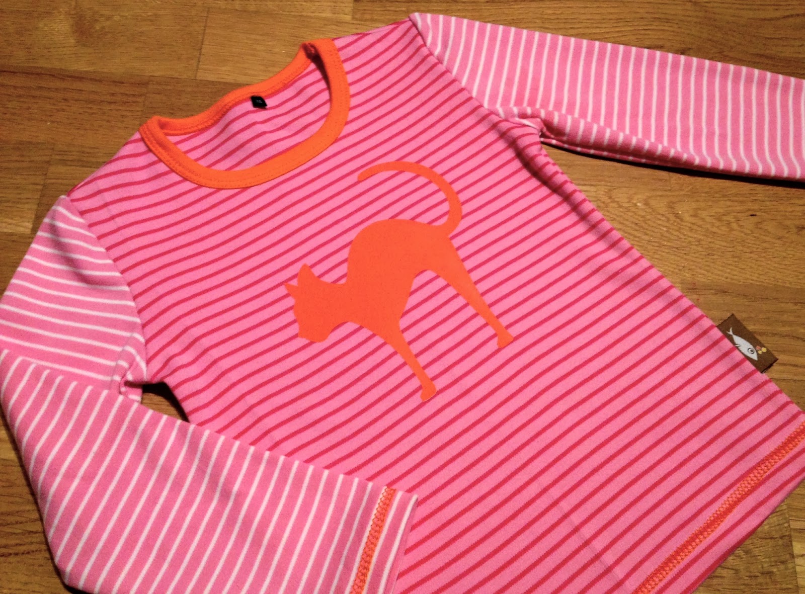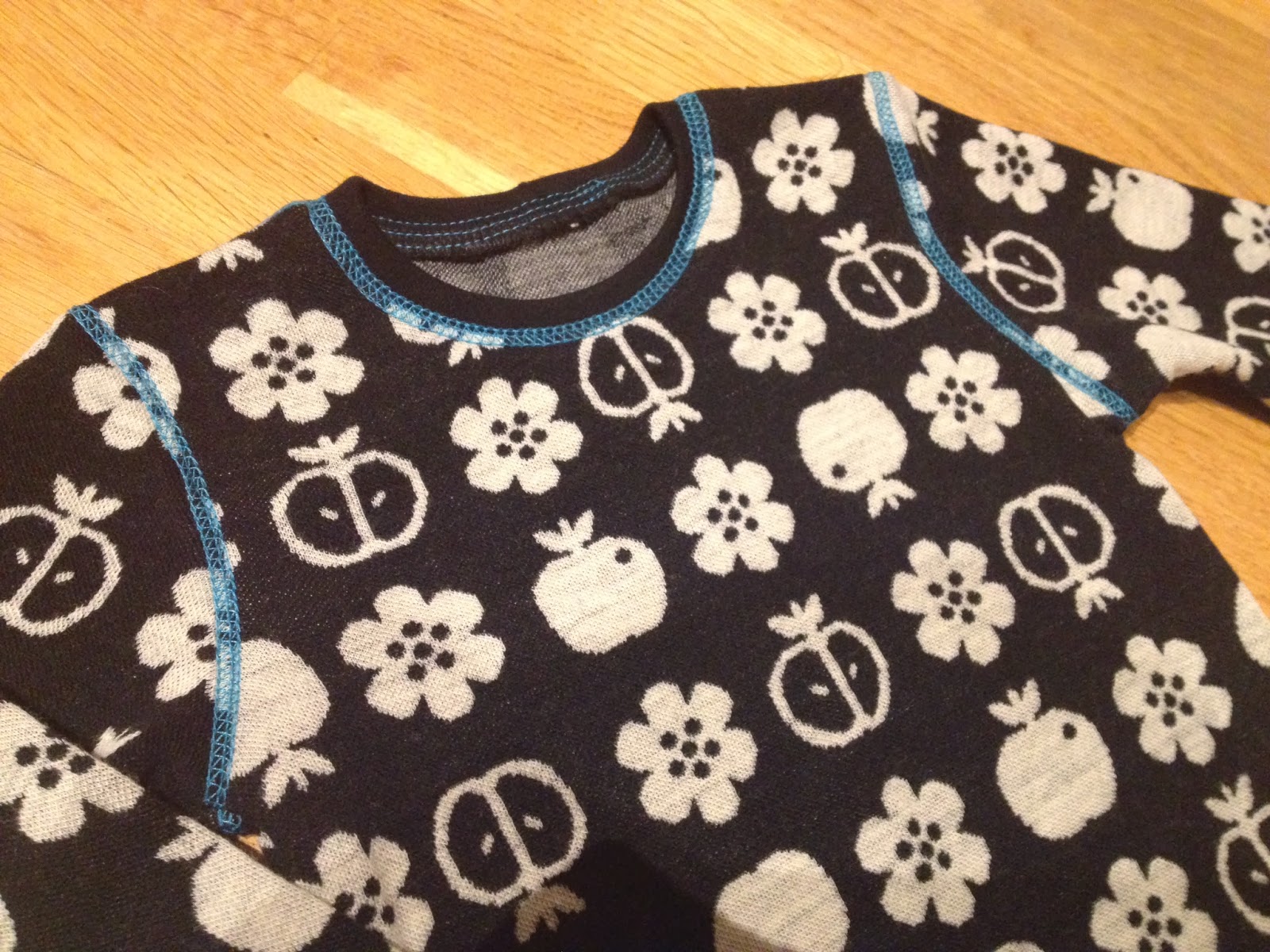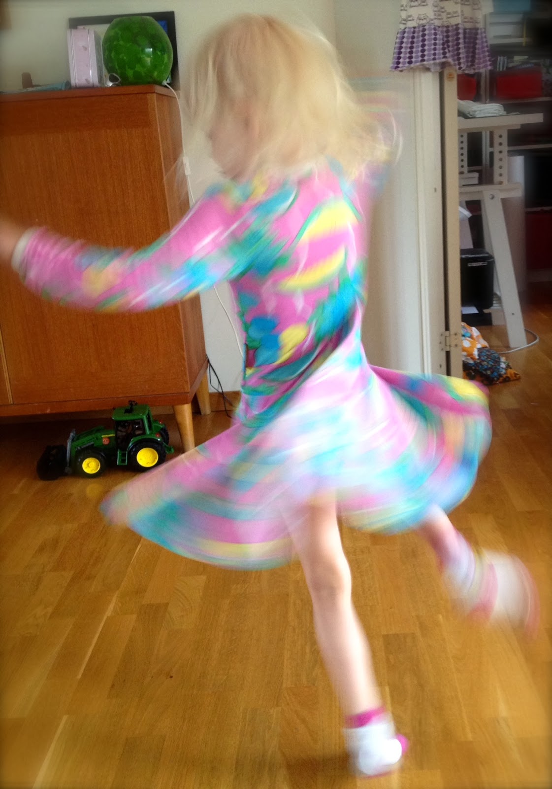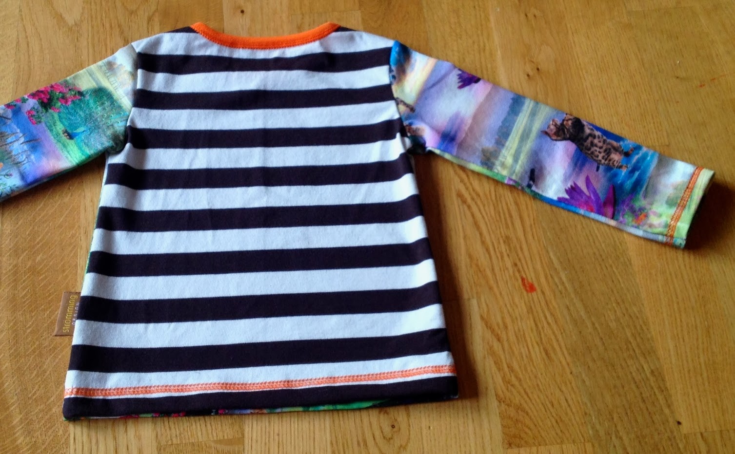 Ritade om dotterns tröjmönster till en A-linjeformad klänning och så gjorde jag en fuskraglanskärning på axeln. Vände även på det randiga tyget ett kvarts varv mellan de två sidorna på axelbiten så att de båda pekar inåt. Tyget är stabilt stickat och det har ungefär lika mycket stretch både upp-ner och åt sidorna så det spelar inte så stor roll hur man vänder det på de här små delarna. På ärmarna vände jag också på tyget men sedan fick jag ränderna att peka utåt istället för inåt trots att jag tycket att jag var mycket noga… Jaja, så kan det gå!