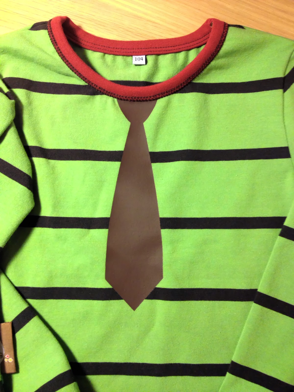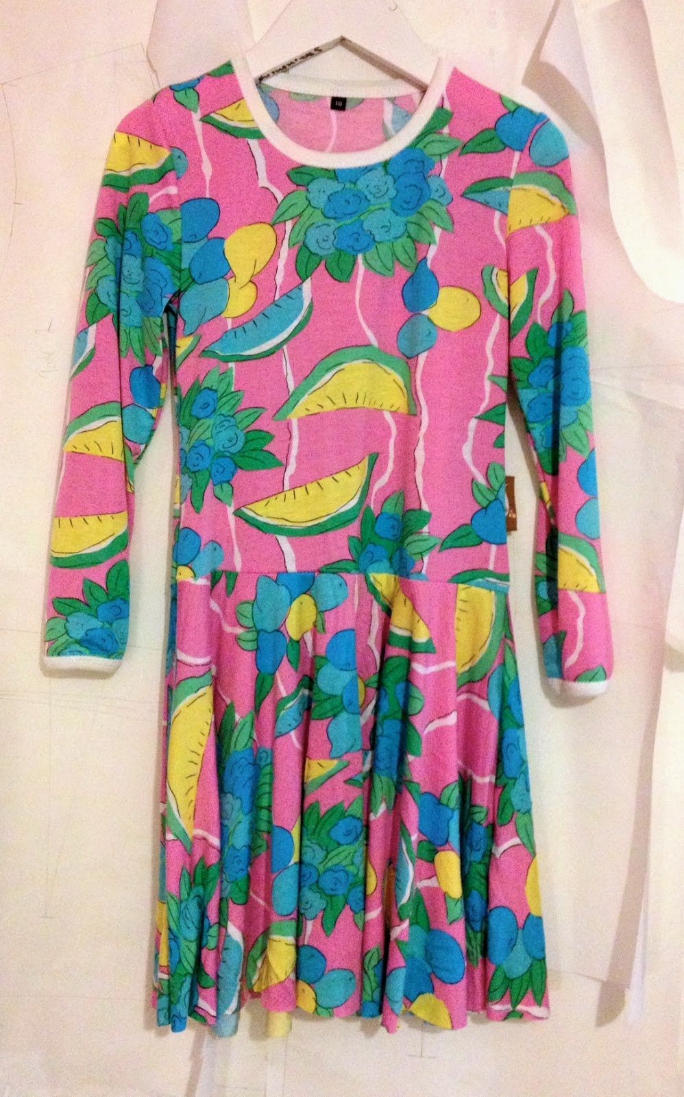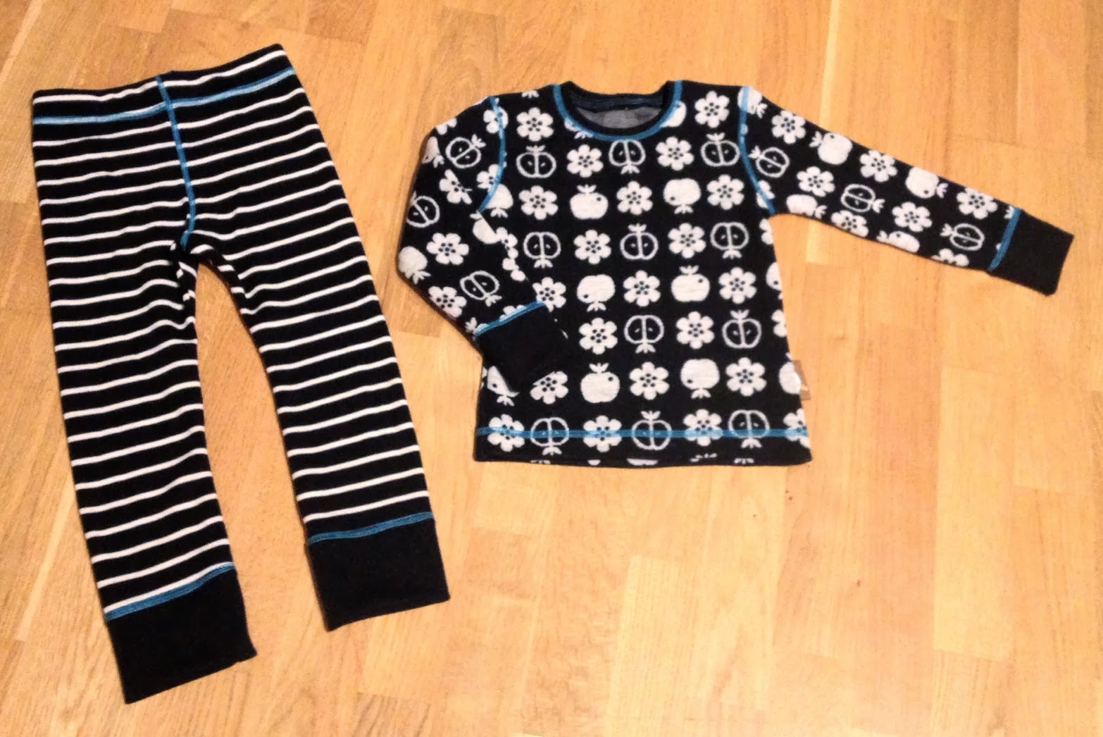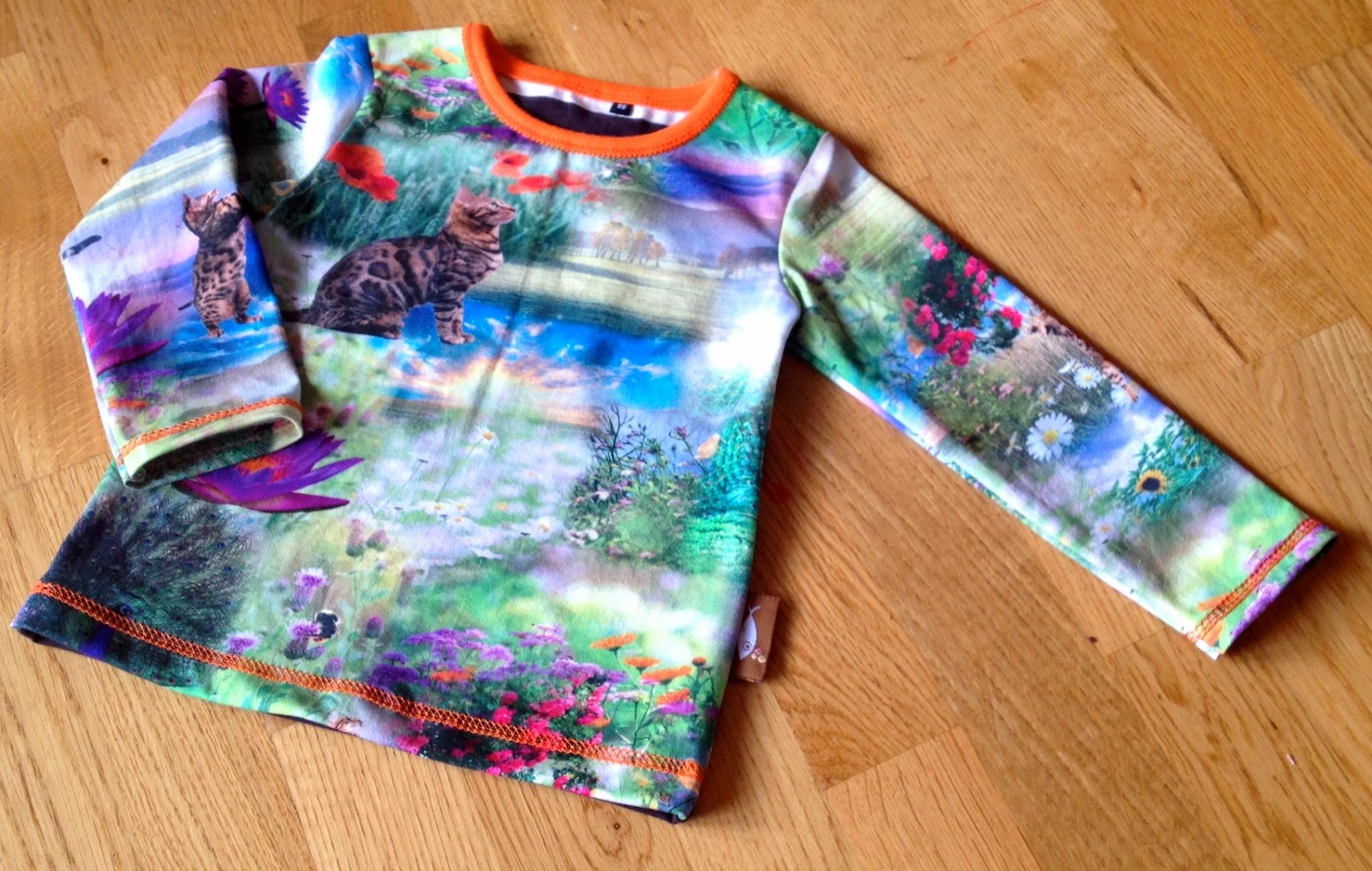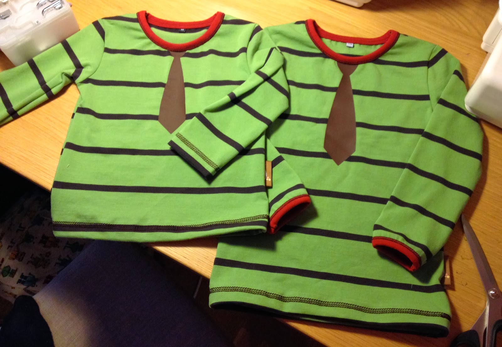 Ritade om dotterns tröjmönster till en A-linjeformad klänning och så gjorde jag en fuskraglanskärning på axeln. Vände även på det randiga tyget ett kvarts varv mellan de två sidorna på axelbiten så att de båda pekar inåt. Tyget är stabilt stickat och det har ungefär lika mycket stretch både upp-ner och åt sidorna så det spelar inte så stor roll hur man vänder det på de här små delarna. På ärmarna vände jag också på tyget men sedan fick jag ränderna att peka utåt istället för inåt trots att jag tycket att jag var mycket noga… Jaja, så kan det gå!