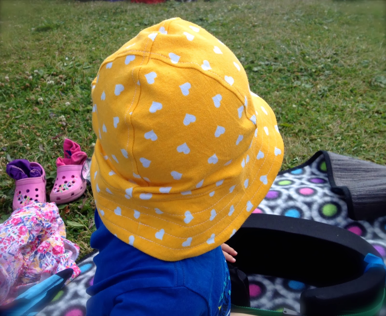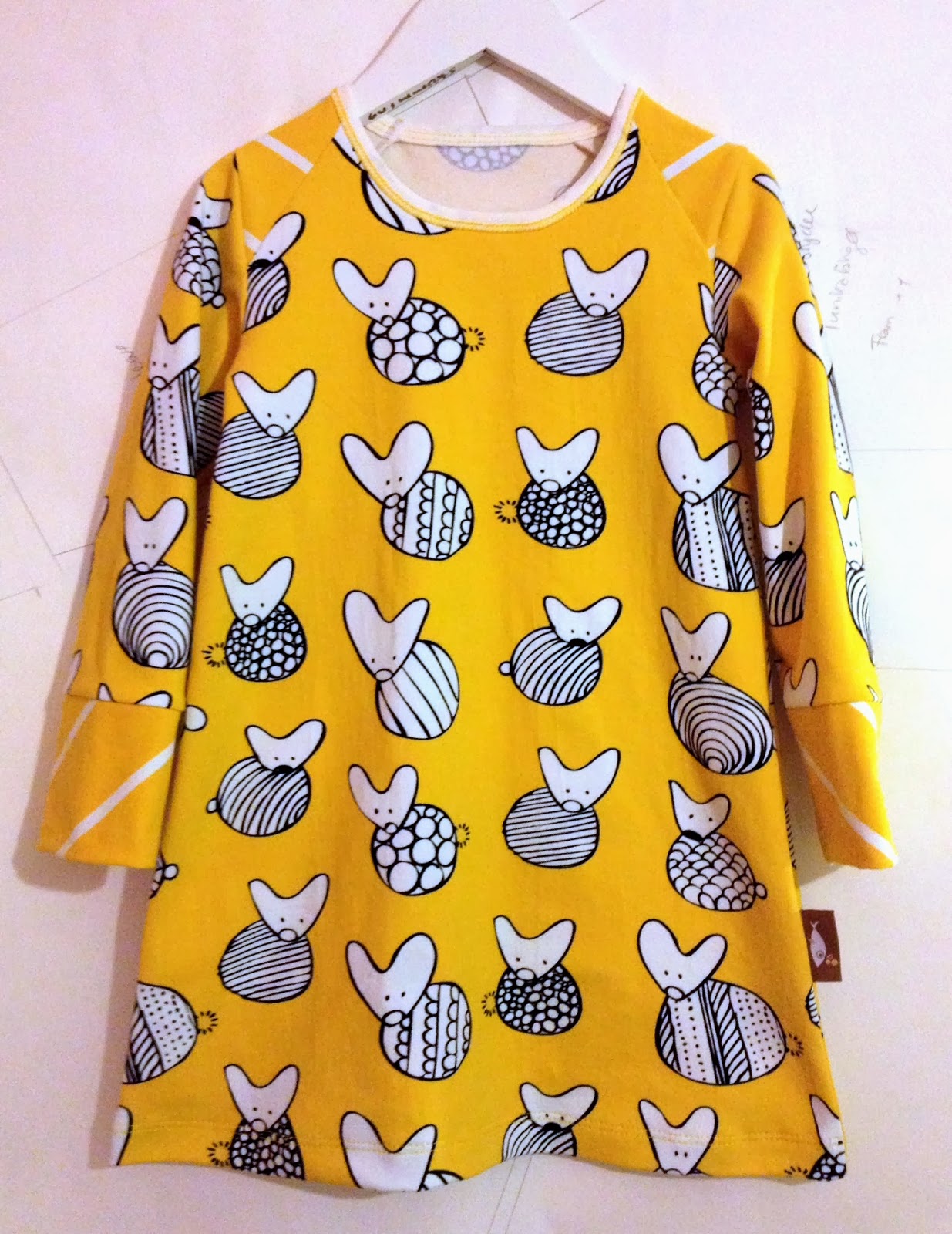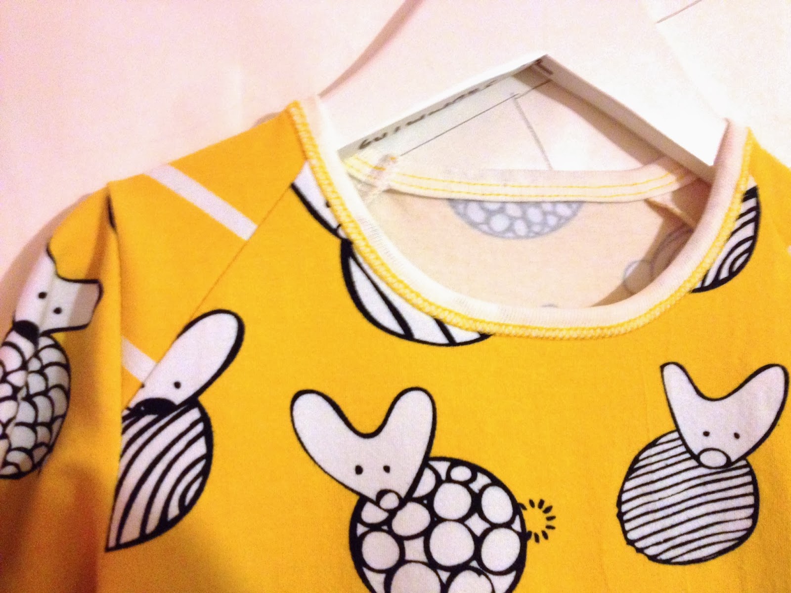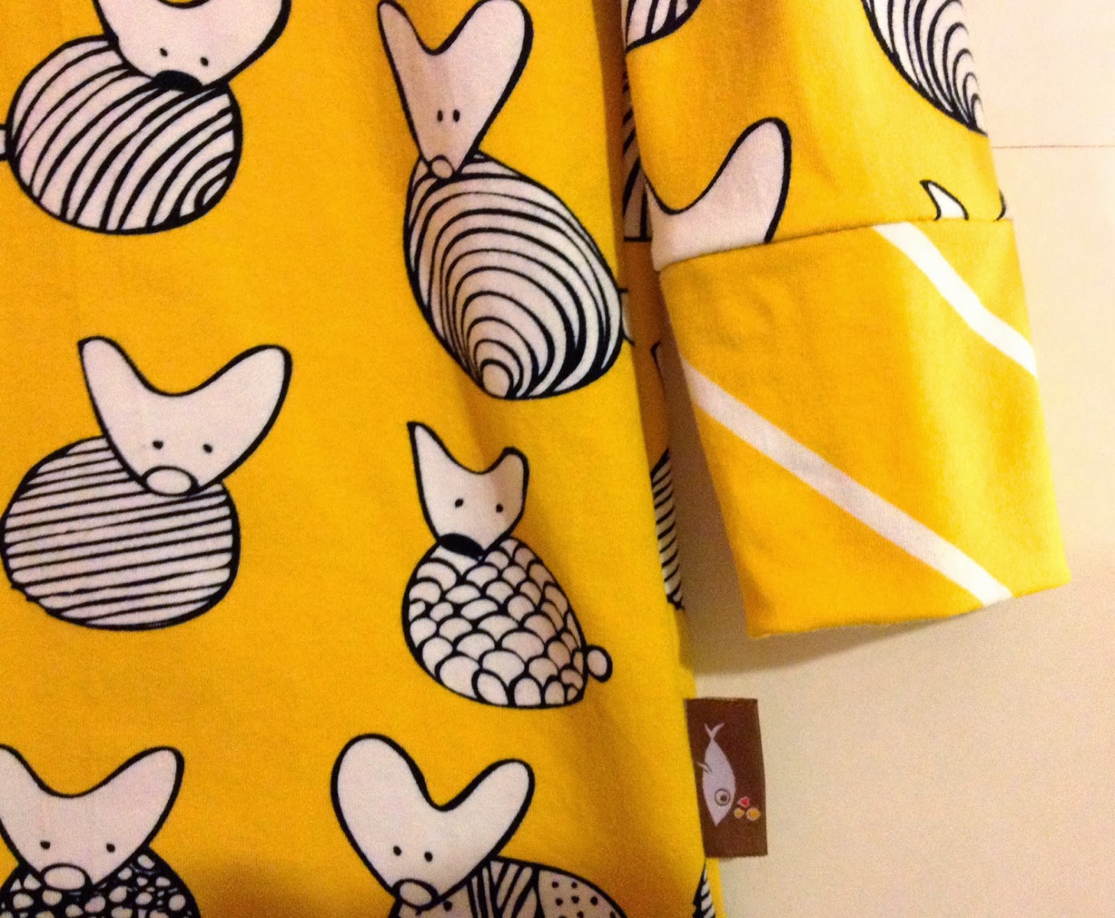 Det här fina tyget heter ”vänner” och är ett ekologiskt tyg som kom tillsammans med det gula diagonalrandiga tyget från I k a s y r. Jag är mycket förtjust i det, lagom gulligt och så är jag en sucker för gult. Min dotter såg tyget och ville gärna ha en klänning i tyget med hjärtdjuren. Först förstod jag inte riktigt vad hon menade men sedan såg jag, vännernas huvuden är ju hjärtformade!
