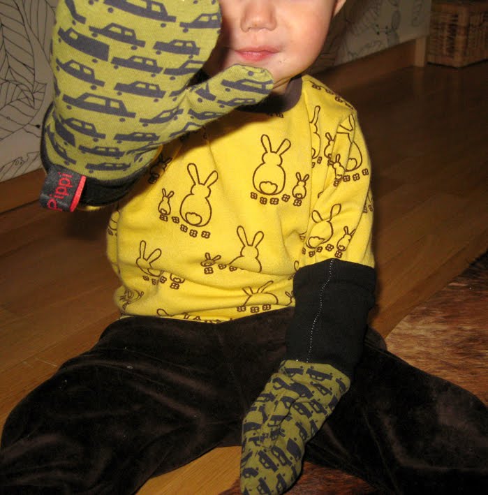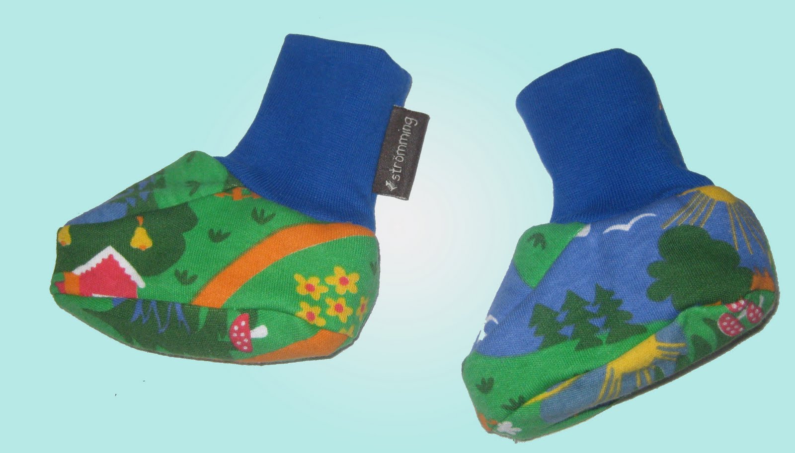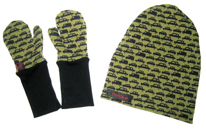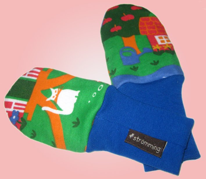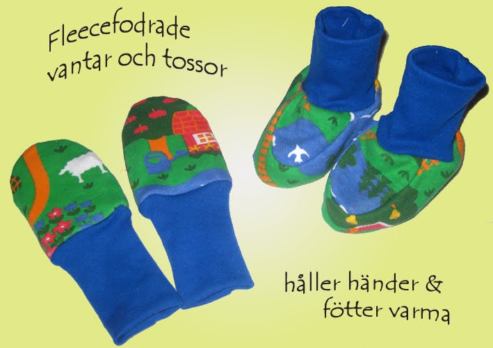Till marknaden ville jag har något lite mindre också så jag har provat att sy vantar utan tumme och tossor. Det här är resultatet av mitt mönsterskapande och nu är jag nöjd. Det har blivit en hel del prototyper de senaste veckorna men nu är jag nöjd med mönstret. Både vantar och tossor är fodrade med fleece för att bebisen ska hålla sig varm och go om händer och fötter.