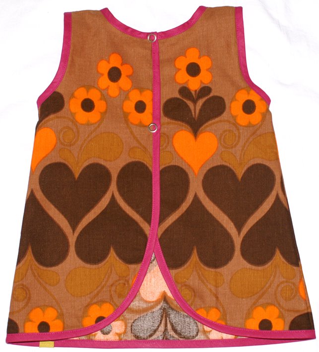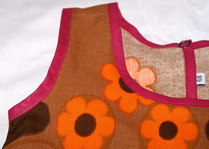 Det stör mig lite att tyget måste ha dragit sig så den är lite skev, det syns inte när hon har det på sig men perfektionisten i mig vet det och det är irriterande. Minns inte heller att det var så bökigt att kanta sprund med sendslå men kanske var det det tunna tyget som gjorde det extra svårt för det drog sig även här och det blev hål i tyget.