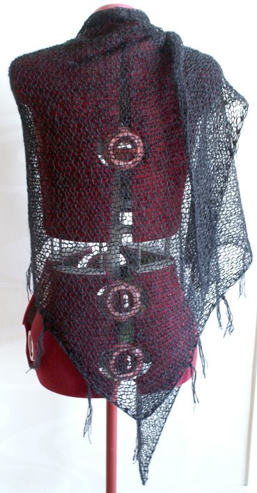 Köpte garnet på syfestivalen och det är ekologisk handfärgad ull från gotland. Garnet heter strand, färgen är antracitgrå och garnet är enkeltrådigt. Mönstret är enklast tänkbara. Jag la upp 4 maskor på stickor 12 och på varje ”rätt” varv ökade jag en maska i andra maskan från kanten. När hälften av garnet var slut minskade jag istället en maska på varje ”rätt” varv. Garnet kommer i en härva med 4 olika delar i sig så när jag gjorde nystan av det tog jag två delar till ett nystan och de andra två delarna till ett annat nystan, på så vis visste jag när jag använt hälften av garnet. På det nystan jag använde först tog jag bort en bit av garnet som jag sedan använde till att göra fransar av.