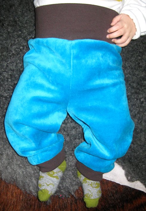 Båda plaggen är sydda i turkos velour från Stoff och Stil. Till byxorna är det brun mudd och på känningen är oken sydda i turkost kanintyg med brunt tryck från jny-design.