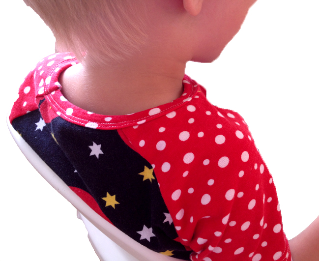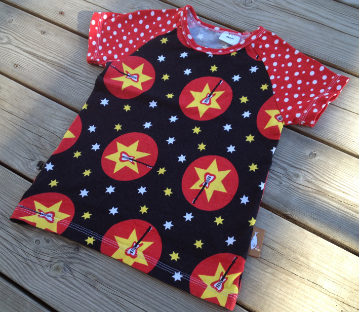 Ritade om mitt mönster för t-shirt i strl 104 till raglan för några veckor sedan och sydde den här tröjan i två nya tyger från Tanyasum. Underbart läckra rockstar för fram- och bakstycke med ärmar och halskant i det prickiga tyget.