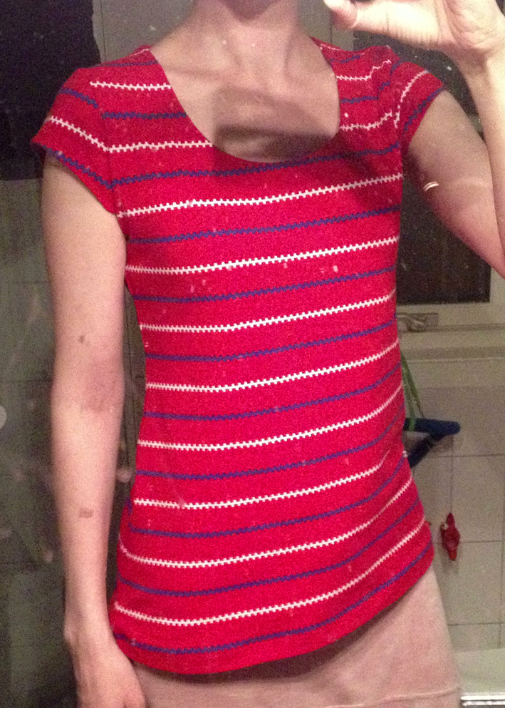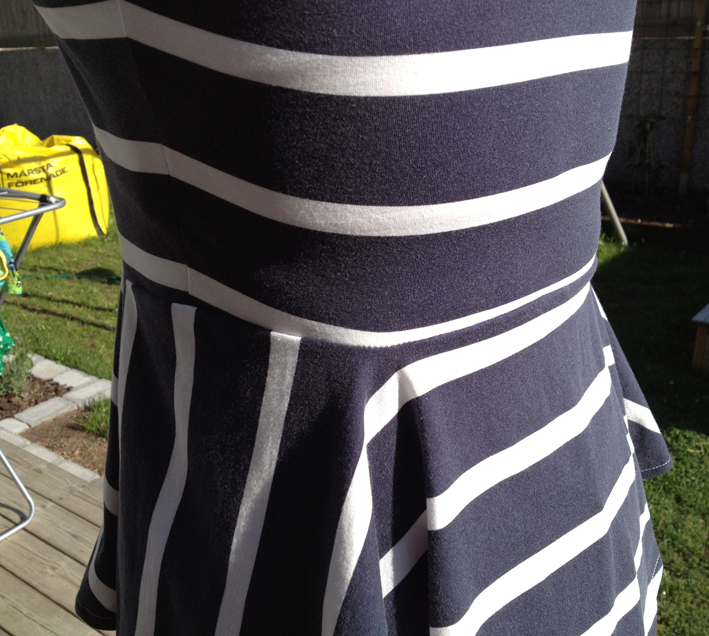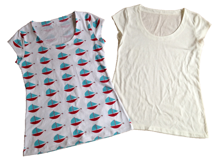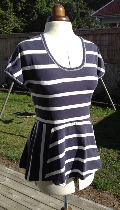 I våras sydde jag tre stycken Rose i strl M. Jag var mitt emellan M och L och tänkte att jag brukar ju köpa M så jag syr M. Den första toppen syddes i en vit bomullsjersey utan lycra, ett vanligt t-shirttyg helt enkelt. Den kändes bra och jag klippte raskt två till och sydde. De går snabbt att sy så det blev två med en gång. Men efter att ha använt dem en gång eller två kändes det inte bra. Det stramade över axlarna, axelsömmarna låg för långt bak och ärmarna (som är fina snäckärmar) åkte upp. De var helt enkelt för små över axlarna. Då är det tur att jag har en mamma som är lite mindre än mig, hon fick påfyllning i sin sommargarderob och jag tror nog att varje gång vi setts i sommar så har hon haft en Rose på sig!