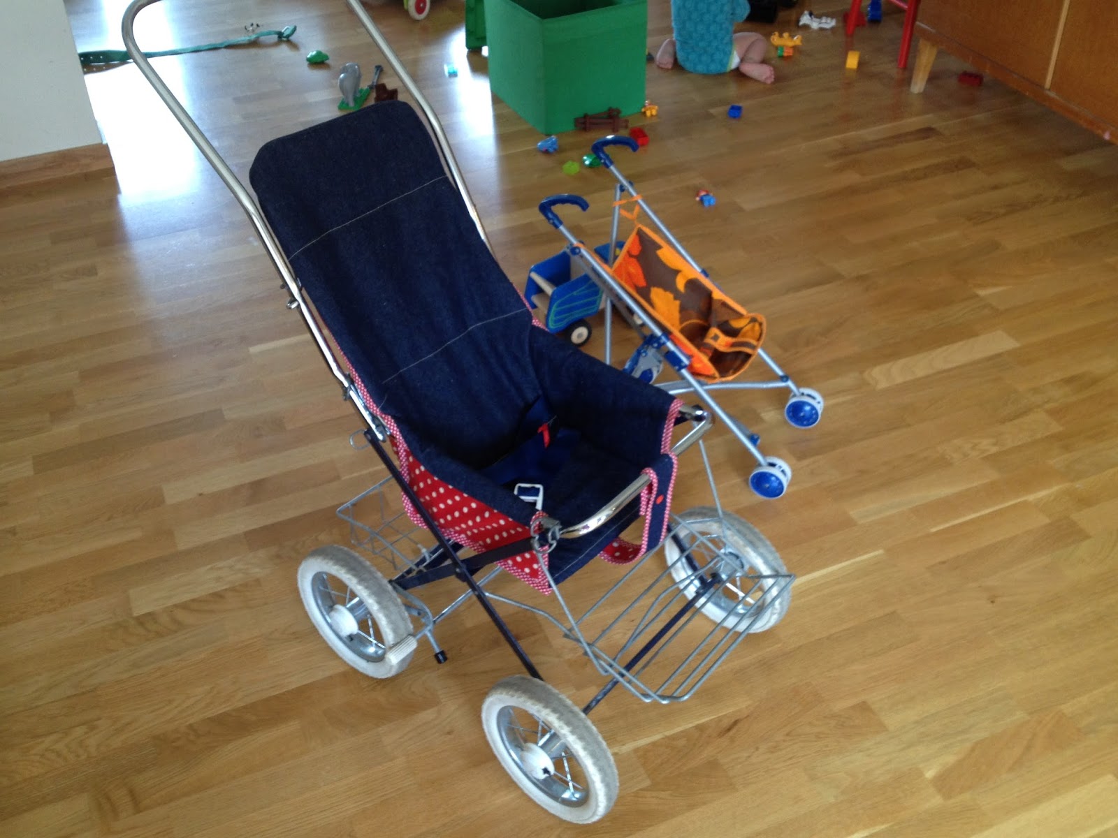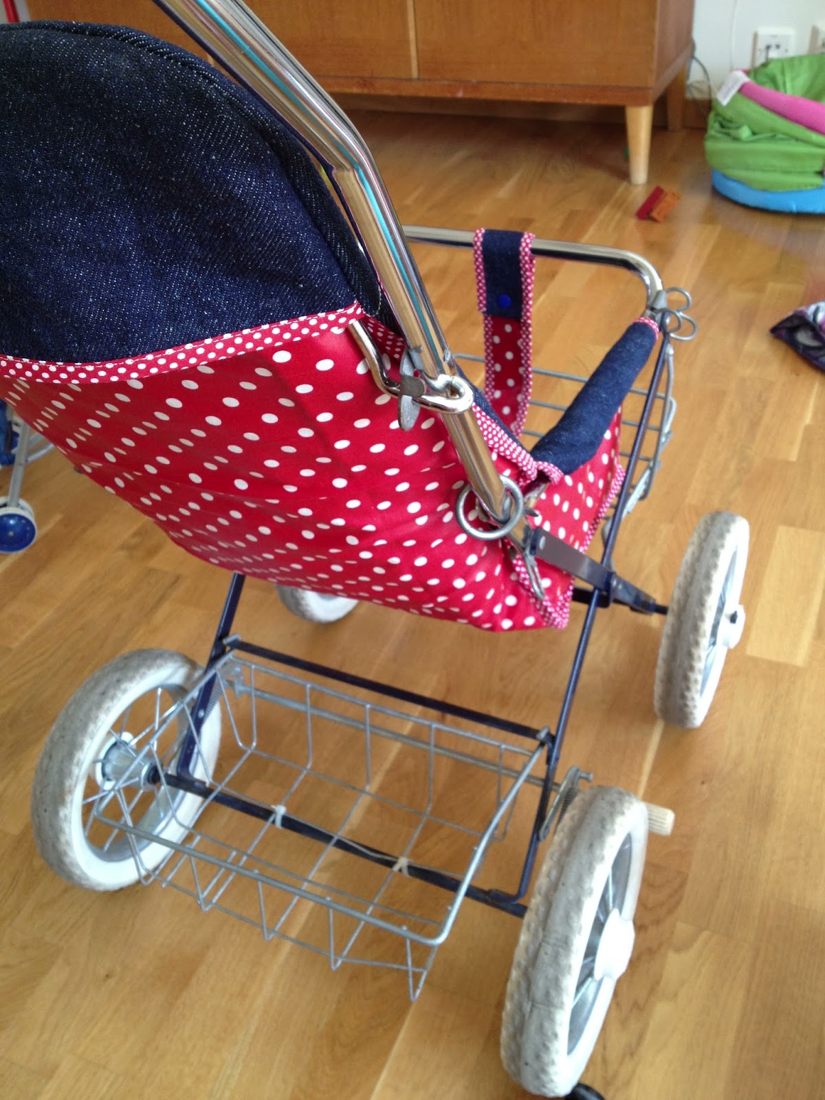 Bakom vagnen ser ni en liten dockvagn som jag sytt en ny klädsel till någon gång. Fick vagnen av en kompis som skulle kasta den för att den köpta klädseln var trasig. Vi klippte sönder klädseln en dag, jag och storasyster, och sydde en ny. Tog nog max 1 timme. Vagnen har lekts mycket med sedan dess och är nu en av lillebrors bästa leksaker. Han är nästan 19 månader nu och älskar att köra allt med hjul!