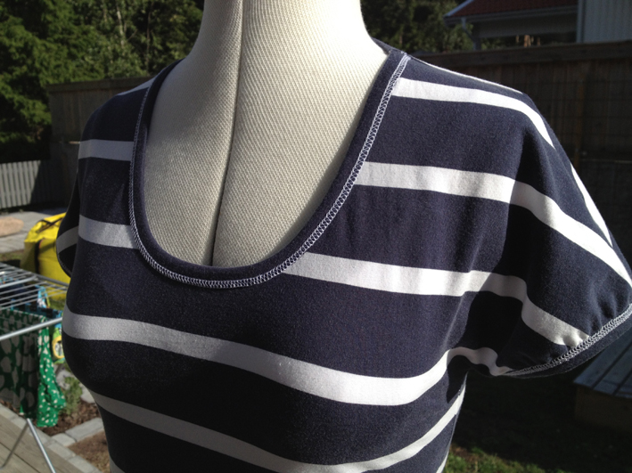 Den första hummingbirden jag sydde var helt efter mönster men jag behövde en liten justering i axeln då mina axlar lutar framåt. Det behövs nästan alltid en förskjutning av axelsömmen för att den ska hamna på rätt ställe. Passade också på att göra en ”small bust adjustment” och ta bort lite tyg ovanför bysten men hjälp av ett veck som går från ärmhål till till inre axelspets.