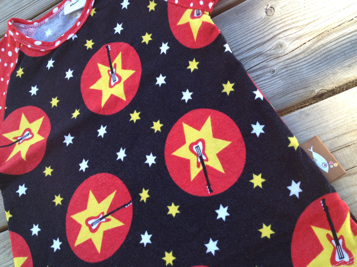 Tygerna finns båda två i butiken och heter Rockstar samt Dots. Båda är ekologisk bomullsjersey med lite lycra i. Härliga tyger tycker jag!