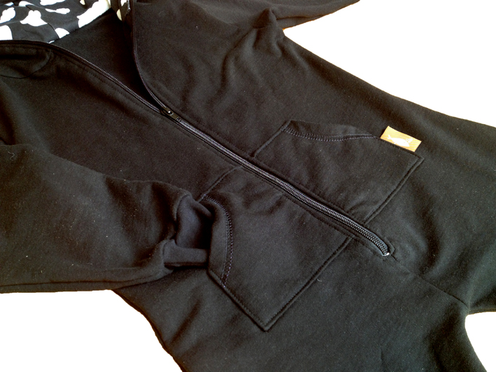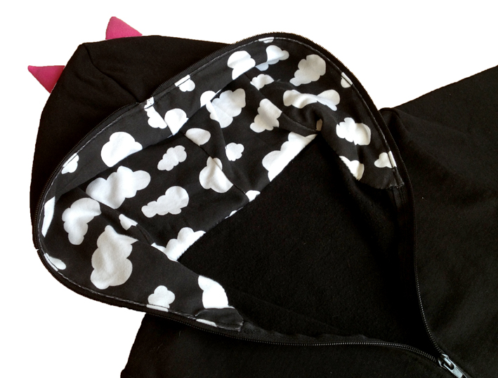 Detta sa min dotter till mig i början av sommaren. Och snäll som man är, samt glad över att hon önskade sig något annat än rosa prinsessklänningar, trollade jag fram en lagom stor bit svart college ur skåpet, en exakt på centimetern lagom lång dragkedja, ett tyg till att fodra luvan med som var helt OK för dottern samt rosa till öronen. Mönster fanns också hemma så det var bara att sätta igång. Ritade bara om luvan lite för att kunna få fast öronen (i insnitt) samt gjorde luvan djupare så det skulle gå att dra dragkedjan hela vägen upp. Öronen har förresten dottern ritat själv och hjälpt till att sy, det var mycket noga med designen av dessa.